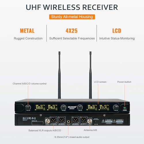 UHF Wireless Microphone System, Quad-Channel Wireless Mic Set w/ 4 Handheld Mics, 260 ft, 4X 25 Frequencies, Dynamic Microphones for Singing, Home Karaoke, DJ, Church, Wedding (MWM-40F)