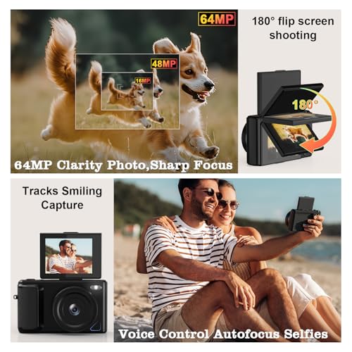 4K Digital Camera with 2.8″ 180° Flip Screen for Vlogging – Camara Fotografica Compact Camera Easy Carry |16X Digital Zoom, 64GB Memory Card with 1500MAh Battery for 2-Hour Recording-Black Y1