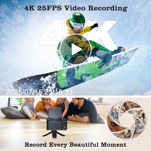 【Multifunctional Point-and-Shoot Camera】This camera digital 4k is loaded with all the features for photos and videos. It has four photo modes (Burst shooting, Timed shooting, Auto photo, and Normal) and four video modes (Time-lapse, Loop recording, Slow-motion, and Normal), plus a bunch of fun filters to play with. It also comes with useful features like a date stamp, exposure compensation (-3.0 to +3.0), and video pause. wonderful for the beginners who want to get creative with their content!