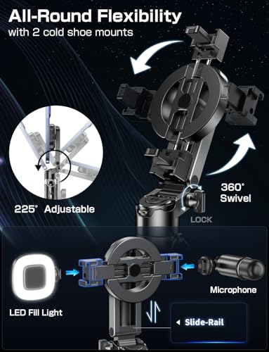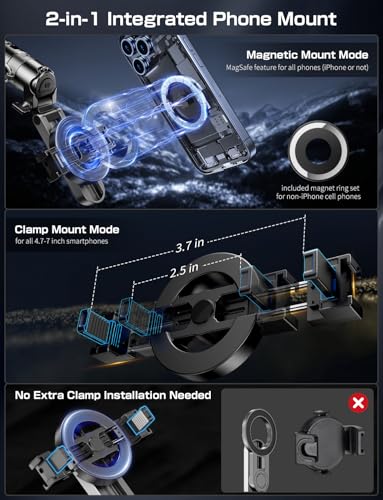 【3-in-1 Combination】3-in-1 Leading Combination of Magnetic Feature, Clamp Function and Cold Shoe Mount. Compatible with Magsafe feature. 2 fold-down Clamp Jaws can rise up to become a clamping mount ranging from 2.5 to 3.7 inches, with anti-slip silicone pads for Highly Steady Grip. Besides, this iPhone tripod stand comes with 2 Cold Shoe Mounts for your Microphone or LED Fill Light if needed.