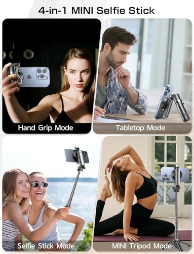 【4-in-1 Multifunction】4-in-1 MINI Selfie Stick (Selfie Stick Mode; Tripod Mode; Hand Grip Mode; Tabletop Mode). Premium Materials: durable ABS & Silicone. Impressive experience in Selfie, Photography, Vlog and Video Recording; Perfect for family, friends, travelers and selfie lovers; Perfect Fit to All 4.7″ to 7″ cell phones (use included magnet ring set for non-iPhone series). An essential for traveling, hiking, sightseeing, picnic, party, KTV, Live Streaming and the like.